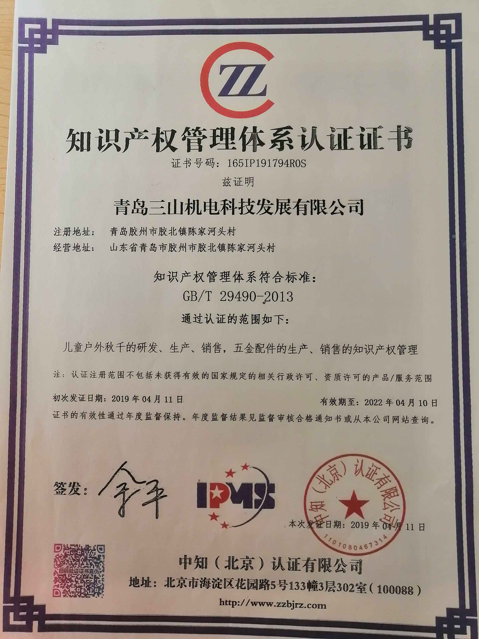 公司深知质量永恒定律,坚持质量是研发制造产品永恒的追求,是公司生存发展的根基,更是产品顺利进入国际市场的需要。在青岛公司创业初期2004年始,公司生产的一系列产品通过了BSCI, SEDEX,ISO9001:2015版质量管理体系和知识产权管理体系,实现国家安全及风险管控双体系认证模式。
